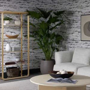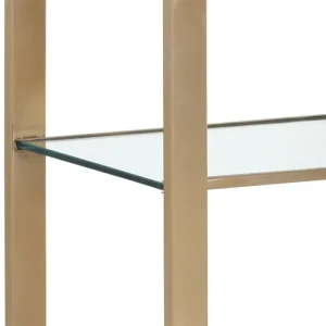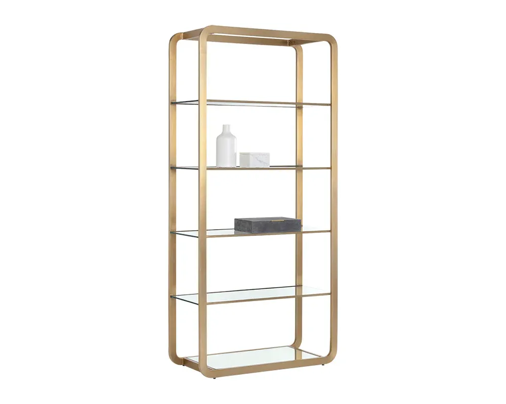This modern bookcase will bring elegance and sophistication to home office, living, lounge spaces and more. Features four clear glass shelves and a mirrored bottom shelf for ample storage. The design also features a round edge frame in brushed gold stainless steel. Made in India: With refined craftsmanship, this design was brought to life by skilled local artisans. By nature, these materials develop unique imperfections such as fissures, markings and colour variations for a truly one-of-a-kind piece.