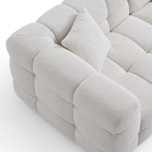Check out our cozy and inviting cushy couch! Crafted with meticulous attention to detail, this sofa features thick boucle fabric known for its softness and durability. With tufted details and 4 short solid wood legs, it’s a simple and comfortable addition to your living room, bedroom, or home office. Perfect as accent furniture to match your decor and beckon you to unwind and luxuriate in its embrace.