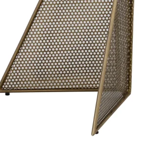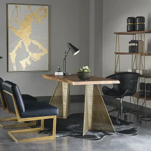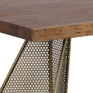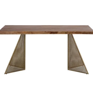 Create an invigorating workspace with this thought-provoking desk. Features a solid, live edge smoked acacia wood top and geometric, mesh-like antique brass legs. Anything but ordinary! As wood is an organic, porous material, these pieces will contain natural variation of texture and may also exhibit fine indentations and cracks. Wood pieces will also display a disparity of colour and grain, and visible knots and burls that add to the character of each piece. Made in India. With refined craftsmanship, this design was brought to life by skilled local artisans. Due to the nature of handcraftsmanship, unique imperfections such as fissures, markings and variations in colour and shape are welcomed and appreciated characteristics for a truly one-of-a-kind piece.