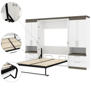 The Bestar Orion Full Eall Bed and 2 Storage Cabinets with Nightstands is the perfect space-saving solution for modern homes. This cleverly designed bed allows you to make the most of your space by folding your bed away when it is not in use. The storage cabinets allow you to store belongings nearby while the nightstands can be used as bedside tables to provide easy access to important items.